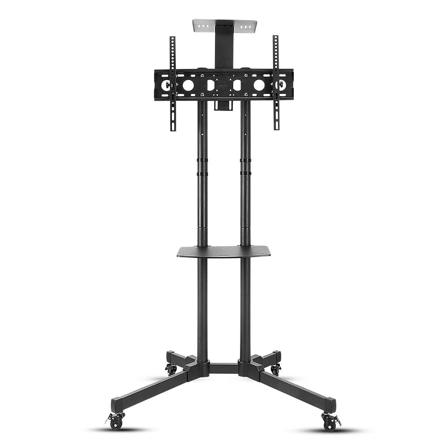 • PORTABLE: TV trolley floor stand equipped with four large heavy-duty casters to move the TV to anywhere you want easily. Wheel it to wherever you want to watch and put it away when you are done. The caster’s can also be locked allows the cart to be stationary or mobile as required. The wheels can move on carpet as well as wooden floor and other rough ground. Tall tv stand with shelves is ideal for outdoor, exhibition, office, hospital, school studio