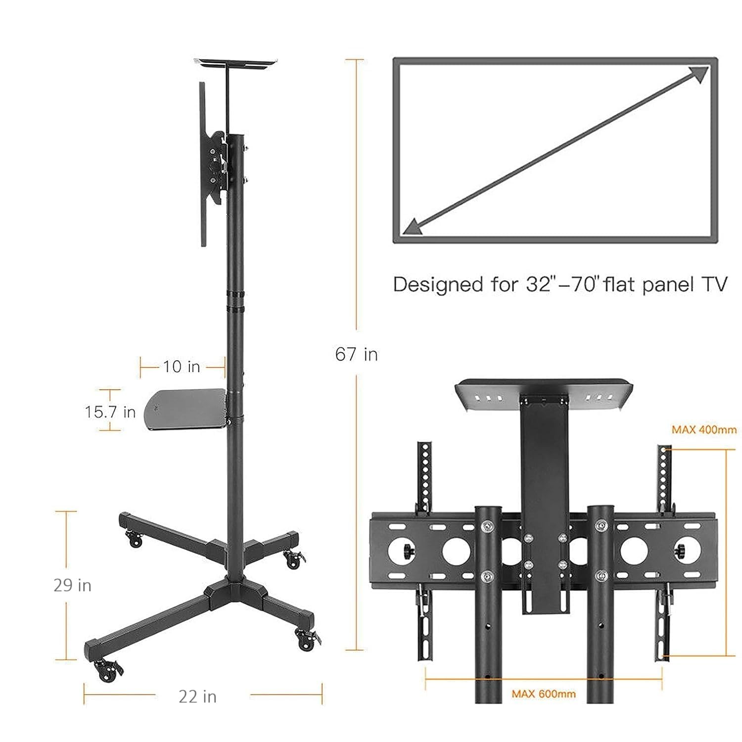 • EXCELLENT DURABILITY: Mobile TV Stand on Wheels is made from solid metal with a powder-coated finish. The frame is strong and heavy duty and can support most of 32″ to 70″ LCD LED flat screens plasma TVs monitor weight up to 80 KGs with VESA from 100 x 100mm to 600 x 400mm.