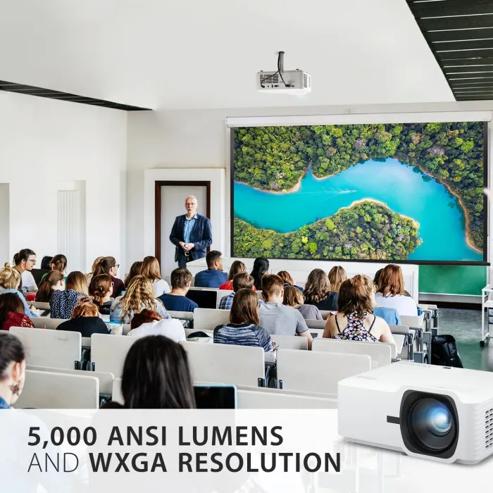 Packed with 5,000 lumens and a high contrast ratio, this projector is guaranteed to produce bright images in large spaces with high ambient light including large boardrooms, conference halls, and auditoriums.